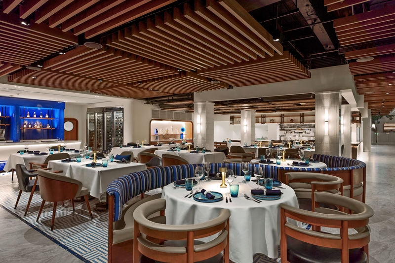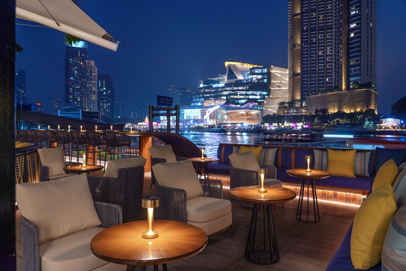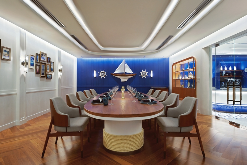 โดดเด่นด้วยการออกแบบตกแต่งภายในทันสมัยในธีมท้องทะเล ท่ามกลางทัศนียภาพอันงดงามของแม่น้ำเจ้าพระยา มองเห็นสีสันของฝั่งตรงข้ามอย่างศูนย์การค้าไอคอนสยาม รวมถึงวิถีแห่งสายน้ำเจ้าพระยายามเย็นไปจนถึงค่ำคืน ภายในพื้นที่กว่า 550 ตารางเมตร จัดสรรเป็นโซนที่นั่งรับประทานอาหารและเลาจน์ ทั้งส่วน indoor ในห้องแอร์เย็นสบายกว่า 50 ที่นั่ง และส่วน outdoor กว่า150 ที่นั่ง รวมถึงมีห้องวีไอพี “Caption Bush” ที่รองรับได้ 12 ท่าน