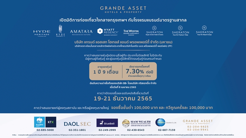 บริษัท แกรนด์ แอสเสท โฮเทลส์ แอนด์ พรอพเพอร์ตี้ (GRAND) เสนอขายหุ้นกู้มีประกันชุดใหม่ “ซึ่งผู้ออกหุ้นกู้มีสิทธิไถ่ถอนหุ้นกู้ก่อนครบกำหนด”