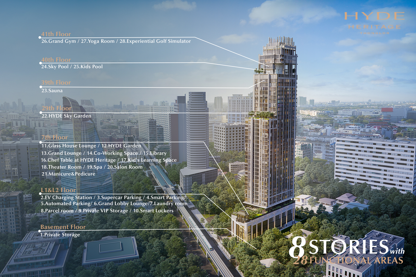 โครงการ HYDE Heritage Thonglor เป็นคอนโดมิเนียมใหม่ Super Luxury เกิดจากความร่วมมือกันของ 3 ผู้พัฒนาอสังหาริมทรัพย์แนวหน้าของประเทศไทยและประเทศญี่ปุ่น โดย Sumitomo Forestry, Grande Asset Hotels and Property และ Property Perfect เป็นคอนโดมิเนียม High Rise 45 ชั้น 1 อาคาร บนพื้นที่ 2-2-18 ไร่ ที่มีความเป็นส่วนตัวสูงเพราะมีจำนวนห้องพักอาศัยเพียง 311 ยูนิตเท่านั้น และเป็นโครงการที่ให้ส่วนกลางภายในโครงการที่เยอะแบบจัดเต็ม โดยแบ่งเป็นทั้งหมด 8 ชั้น 28 ฟังก์ชัน ที่คิดเป็นพื้นที่กว่า 2,000 ตารางเมตร ซึ่งเมื่อเปรียบเทียบกับราคาก็ถือว่าคุ้มค่ามาก การันตีจากส่วนกลางที่ให้เยอะไม่แพ้ใครในโครงการที่ตั้งอยู่บนทำเลเดียวกัน โดยส่วนกลางทั้งหมด 28 ฟังก์ชันจะแบ่งออกเป็นทั้งหมด 8 ชั้นด้วยกัน ดังนี้