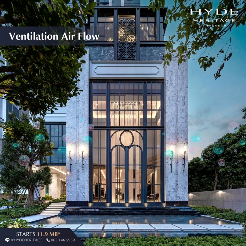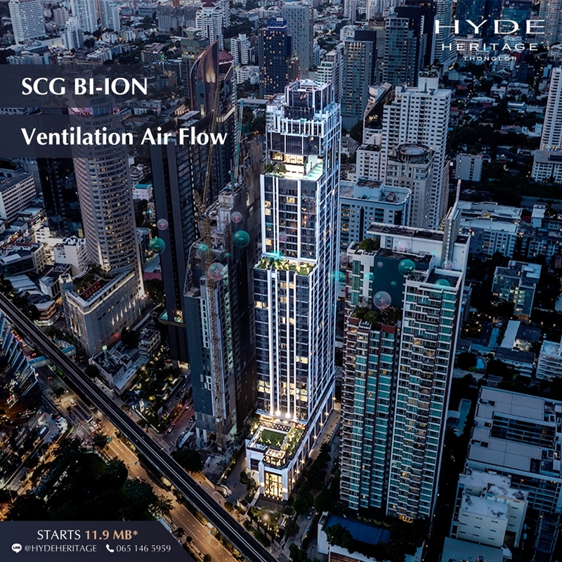 HYDE Heritage Thonglor คอนโดมิเนียมระดับ Super Luxury ที่ตั้งอยู่บนทำเลศักยภาพอย่างทองหล่อ เป็นโครงการที่คิดและออกแบบให้ทุก ๆ ส่วนภายในโครงการสามารถตอบโจทย์การอยู่อาศัยได้อย่างสมบูรณ์แบบ และยกระดับการใช้ชีวิตไปพร้อม ๆ กับการแก้ปัญหาสิ่งแวดล้อมด้วย เรียกว่าดูแลและเอาใจใส่ทุกอณูของผู้อยู่อาศัยได้อย่างแท้จริงด้วยคุณสมบัติที่ครบทุกด้าน และหนึ่งในนั้นก็คือการออกแบบอาคาร และส่วนกลางด้วยเทคนิค Ventilation Air Flow ที่จะช่วยให้การระบายอากาศภายในอาคารเป็นไปอย่าง Flow ตลอดทั้งวัน พร้อมทั้งเทคโนโลยีสุดล้ำจาก SCG Bi ion ที่จะช่วยกำจัดสิ่งปนเปื้อนในอากาศ ทำให้มั่นใจได้ว่าอากาศที่เราหายใจเข้าไปนั้นสะอาดและปลอดภัยกว่าอย่างแน่นอน